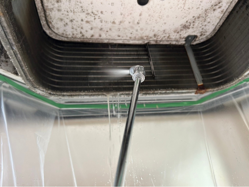 特に、汚れたアルミフィンコイルを薬品にて高圧洗浄する事により熱交換率が上がり電気代を節約する事ができます。